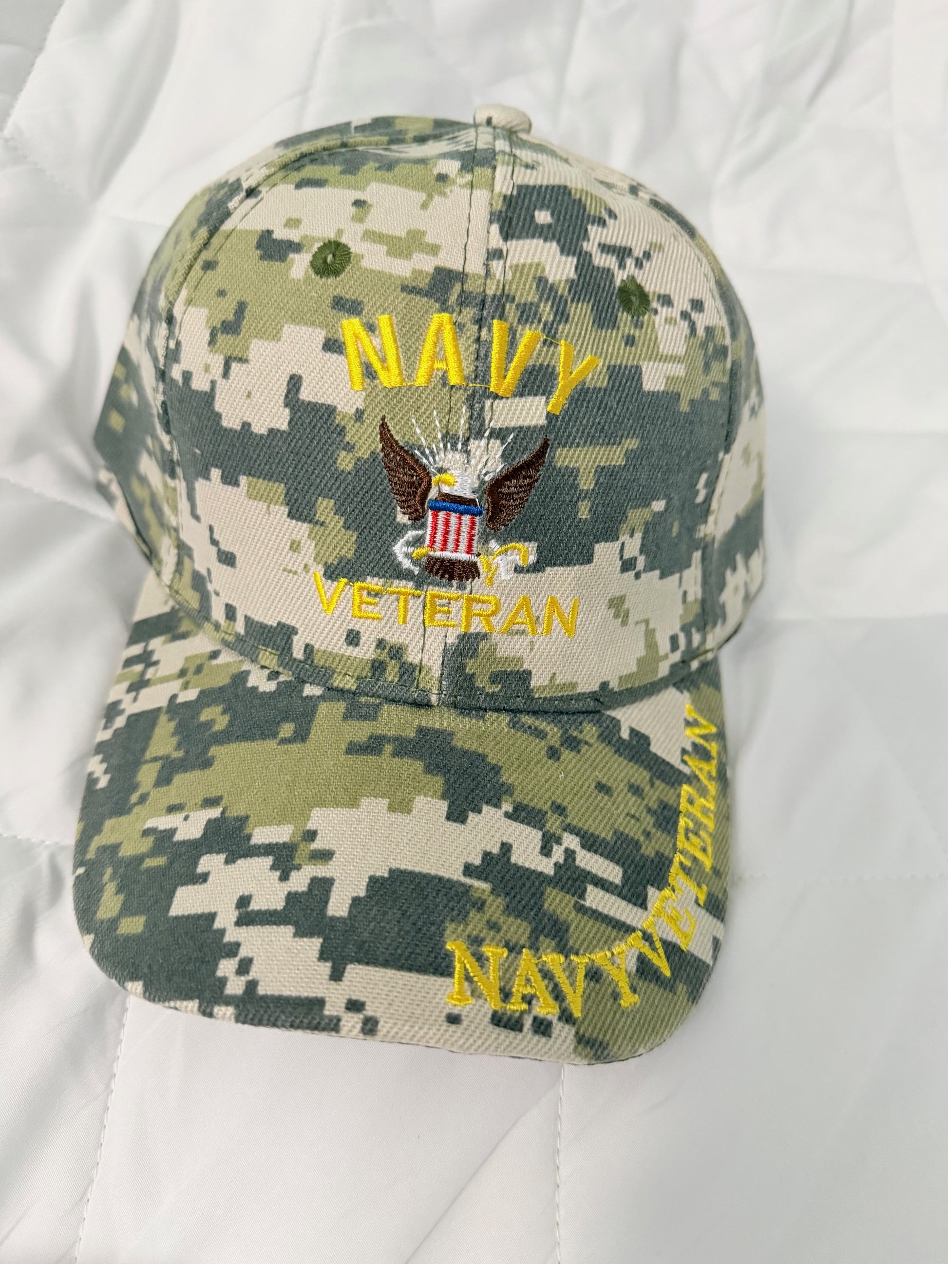 Camo with Yellow Letters embroiled with Navy logo, Adjustable, Velcro strap closure.