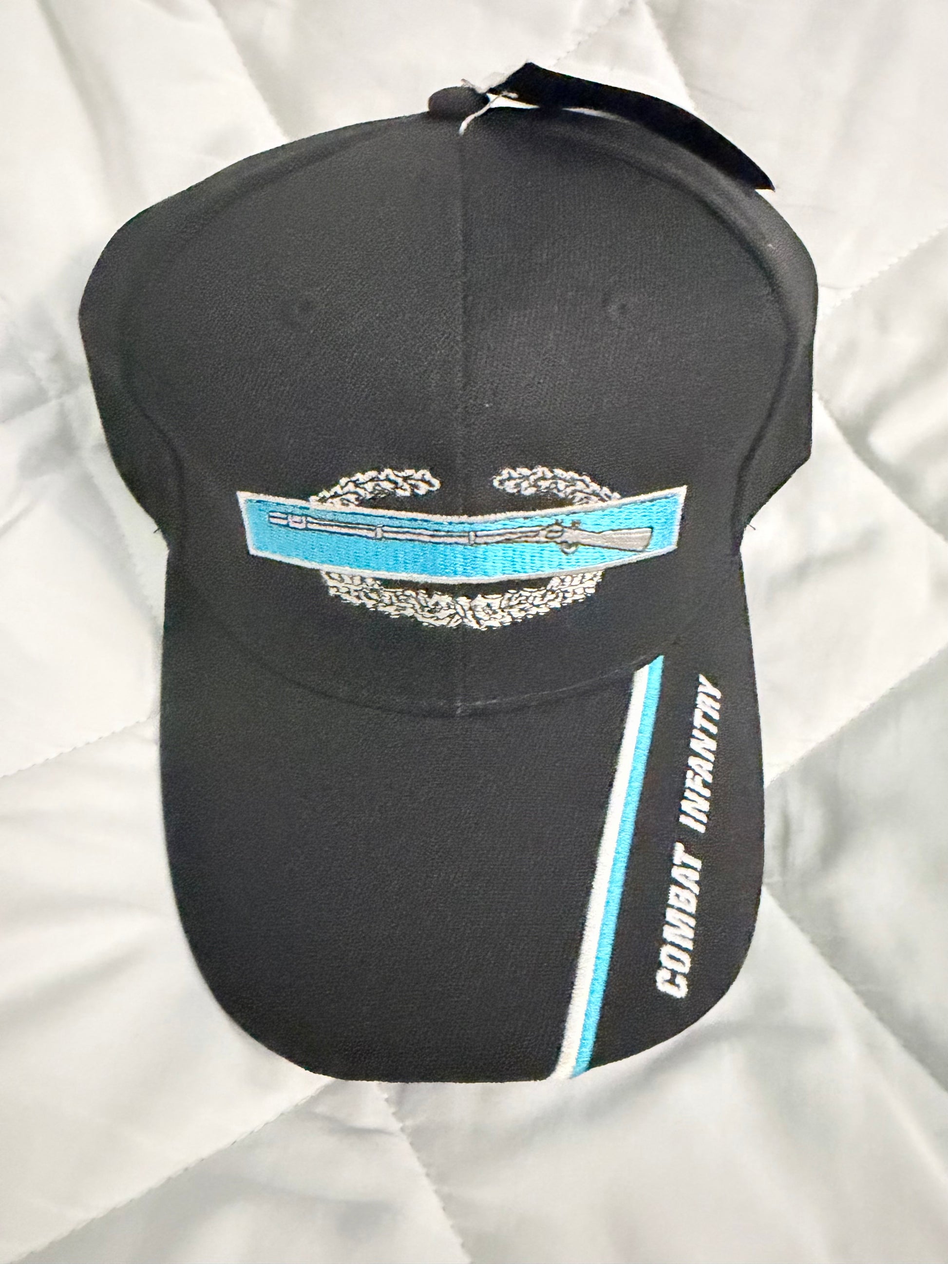 White Letters Letters embroiled Combat Infantry Service logo, Adjustable Velcro strap closure.